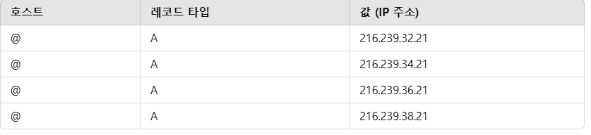 ✔ A 레코드 4개 등록 (선택 사항): - 216.239.32.21
